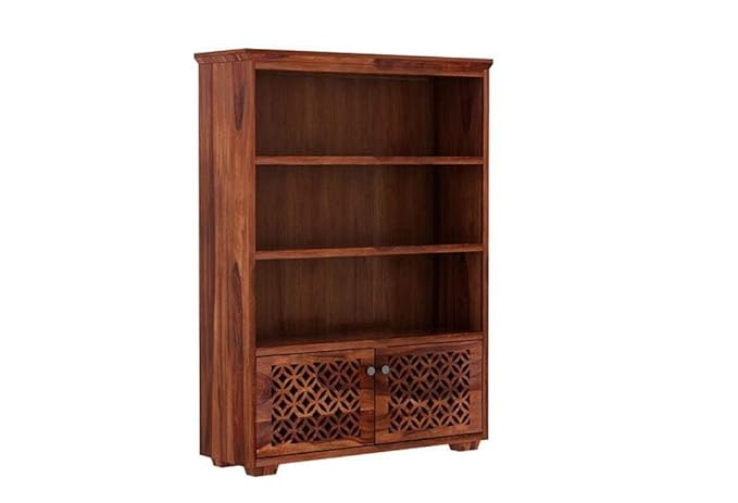 NESTHONEST Wooden Book Shelf for Living Room | Open Bookcases with 3 Shelf & 2 Doors Cabinet Storage | Display Unit for Home Furniture | Solid Wood Sheesham, Honey Oak